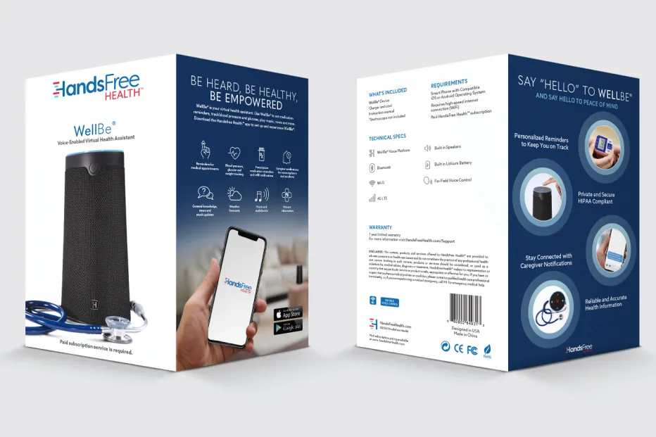 The packaging for Wellbe® is meant to attract consumers and inform them of the many features and benefits of the voice-activated health support system.
