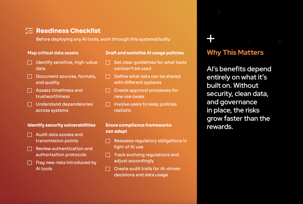 Let’s set the shiny tools aside for a moment. AI only creates lasting value when security and readiness come first. Skip this step, and results will be unreliable—and risks will grow.